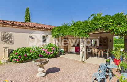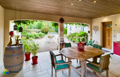 La grande terrasse couverte, dotée d'une cuisine d'été entièrement équipée et d'un coin repas parfaite pour recevoir à l'extérieur, avec un accès direct au jardin et à la piscine.