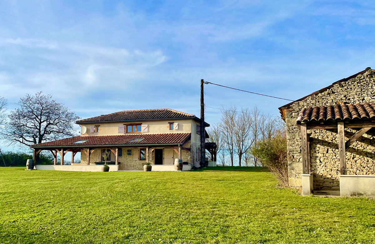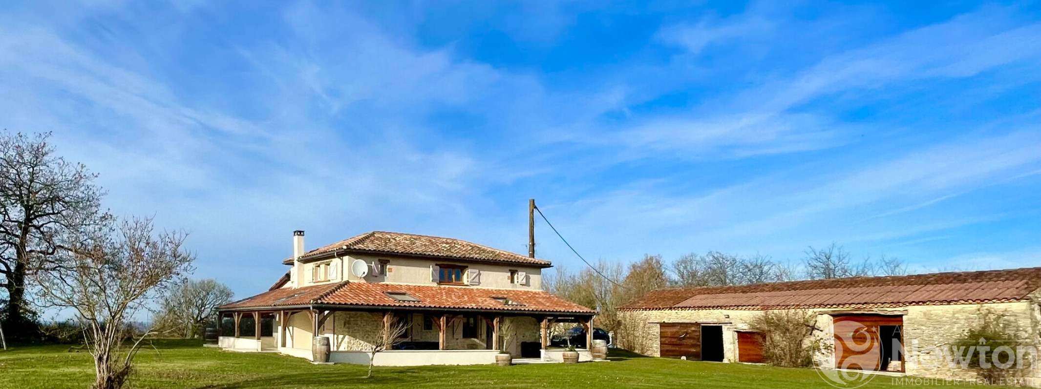 La maison est entourée d'un terrain arboré de 1,79 hectare, avec une vue dégagée sur la campagne vallonnée du Sud-Ouest.