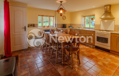 Cuisine / salle à manger ? Cuisine moderne et spacieuse, avec ouvertures sur trois côtés, carrelée et suffisamment grande pour accueillir aisément 8 personnes autour d'une table.