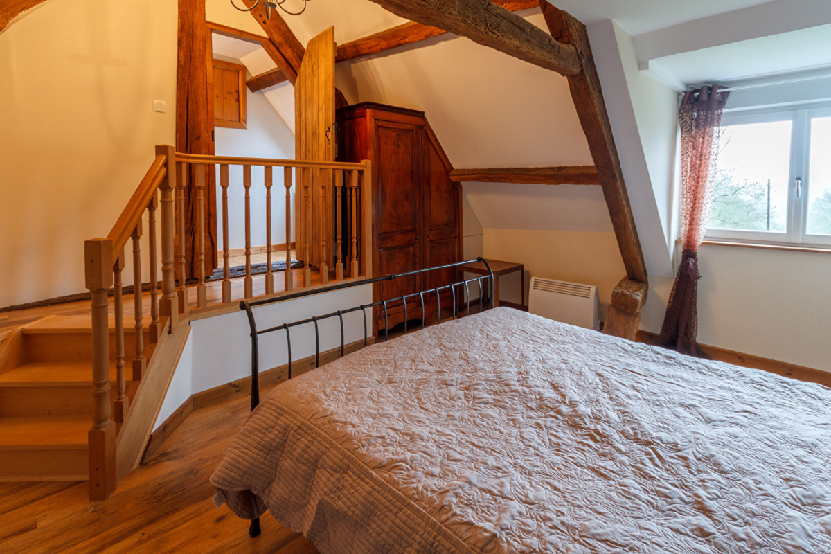 Chambre principale ? Petit escalier descendant vers la chambre, double exposition, sol stratifié, poutres apparentes, placards de rangement.
