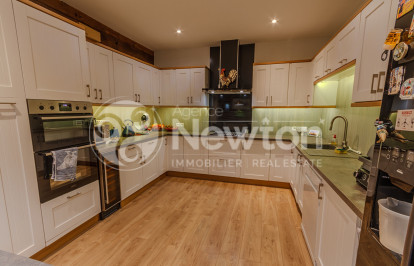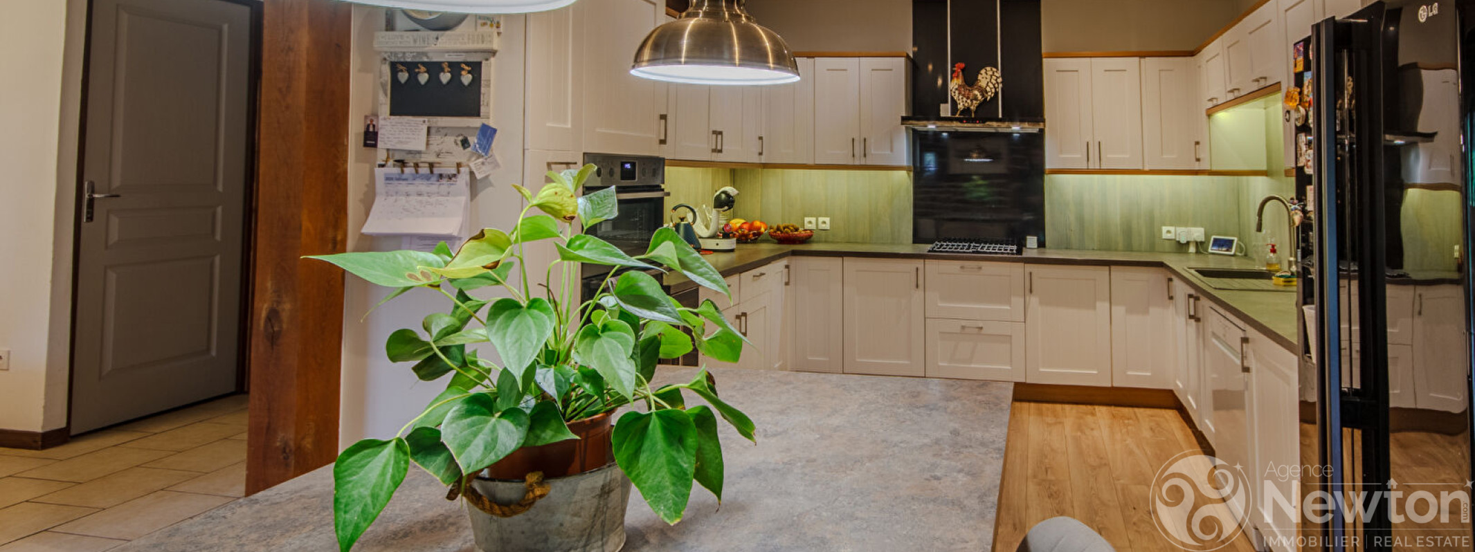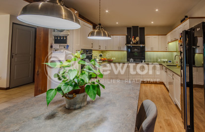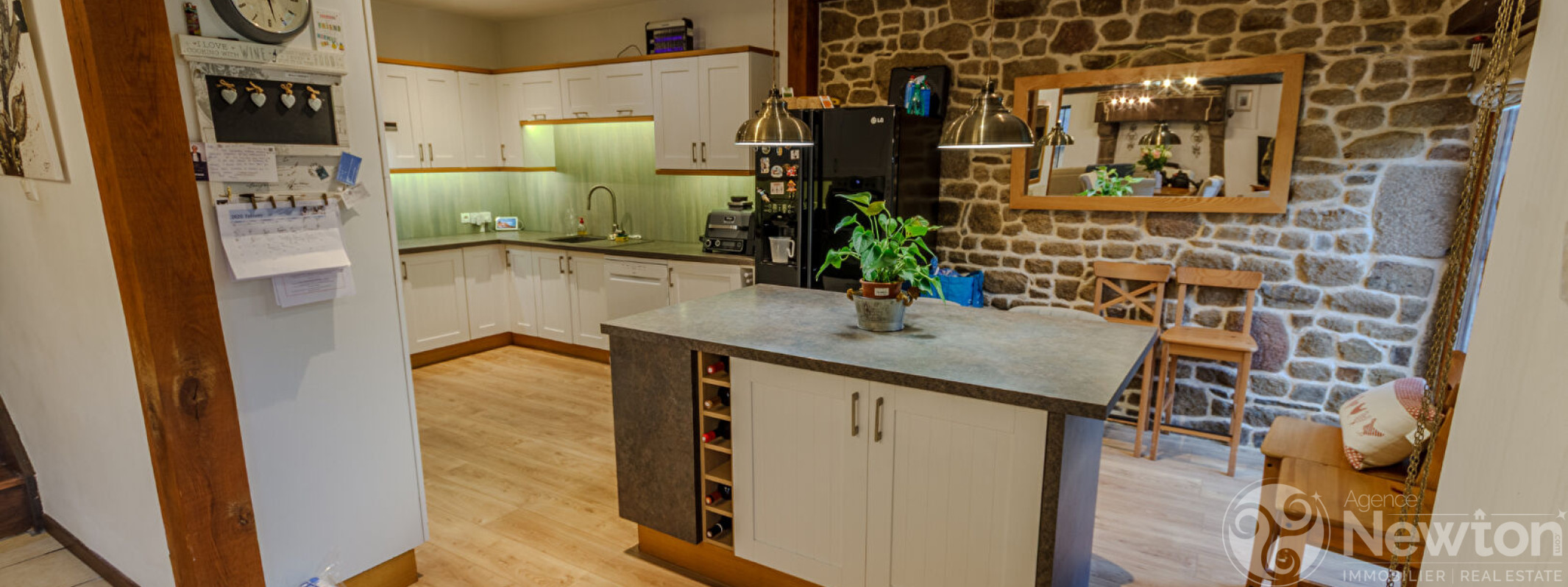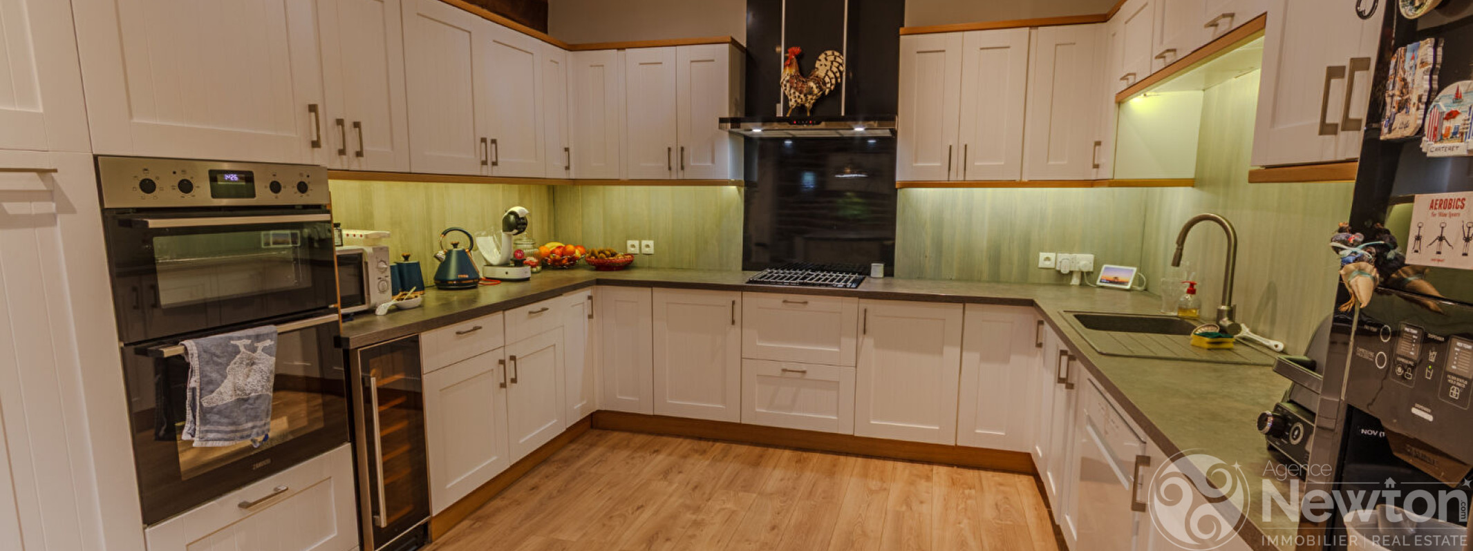 Cuisine : cuisine moderne aménagée et équipée avec îlot central, portes-fenêtres donnant sur le jardin.