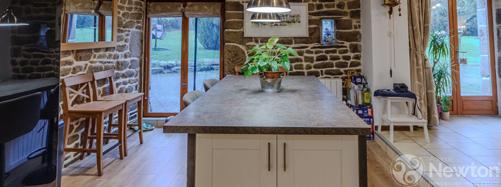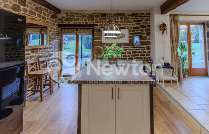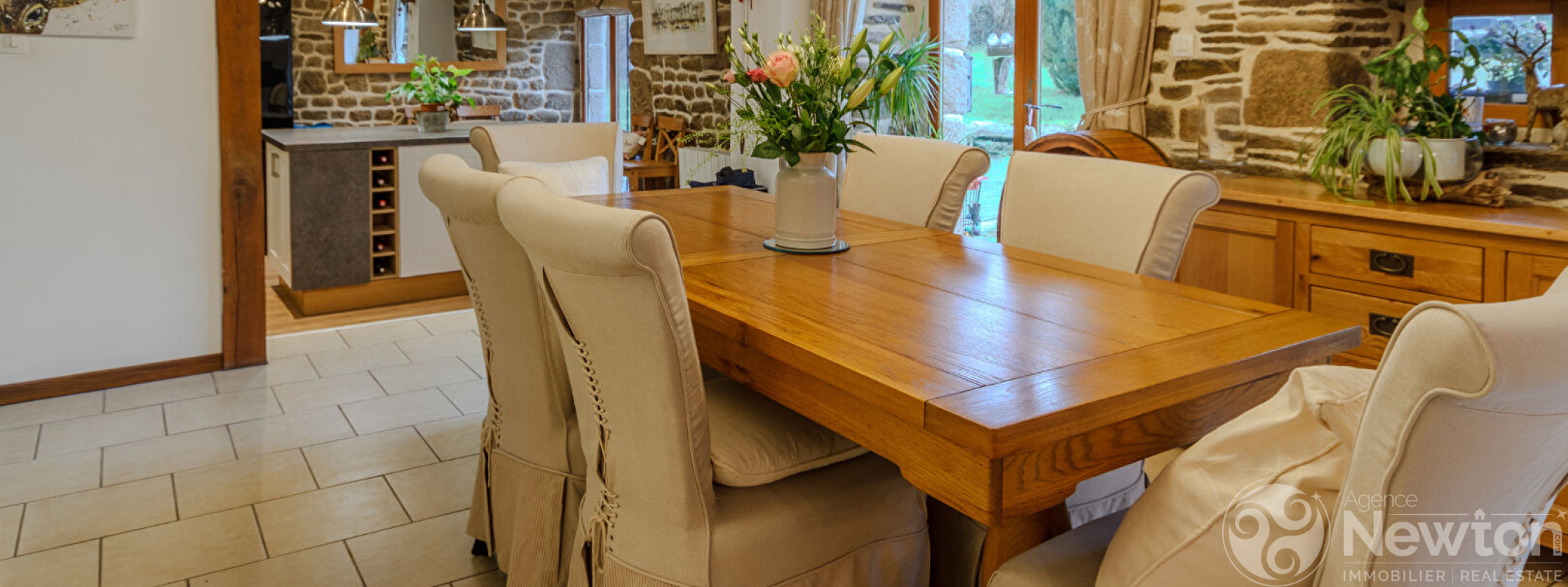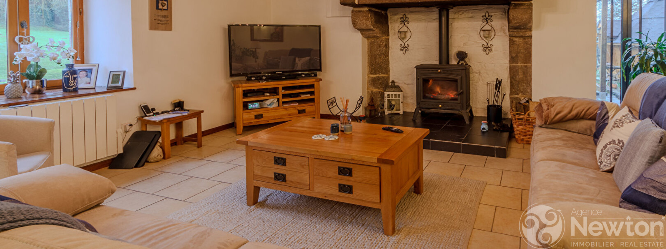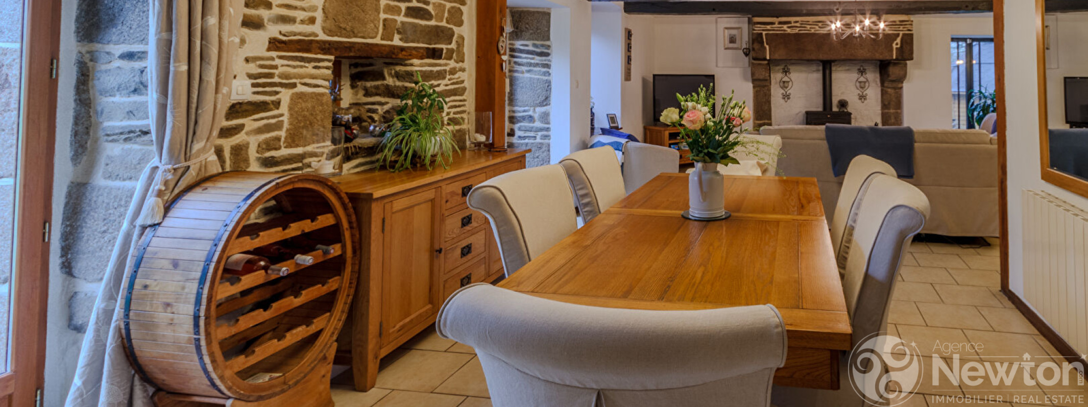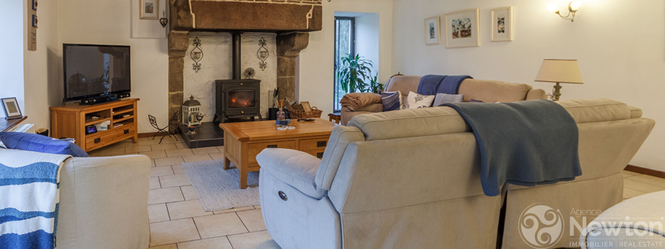 Salon / Salle à manger : doubles portes-fenêtres donnant sur le jardin, double exposition, avec cheminée en granit de caractère et poêle à bois.