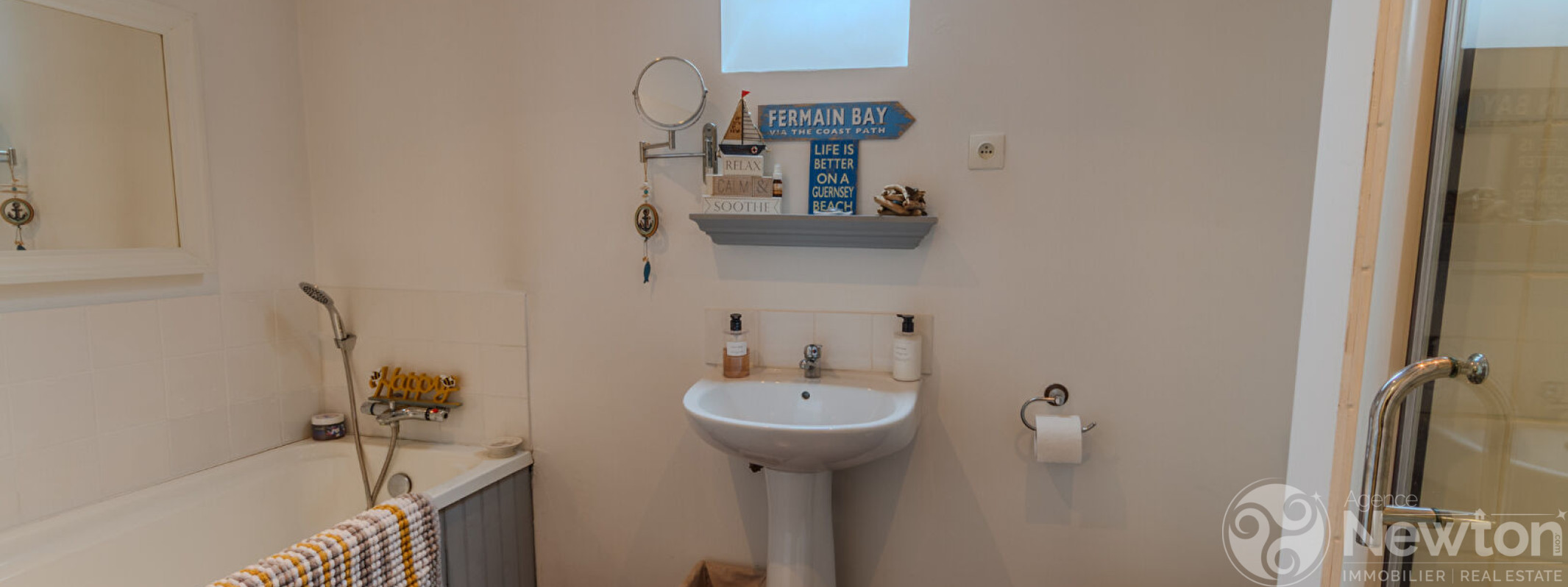 Salle de bains familiale avec baignoire, douche, lavabo et WC.