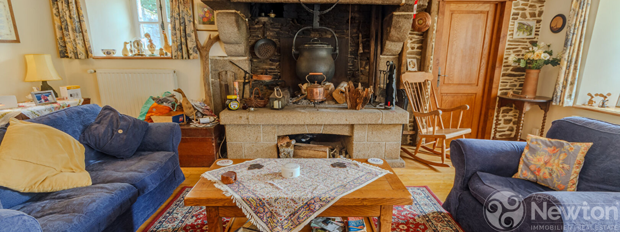 A l'intérieur, vous trouverez une cuisine aménagée et équipée, une cheminée ouverte avec chaudière « Marmite », un salon/salle à manger, une buanderie, une salle d'eau avec WC au rez-de-chaussée, une chaufferie et une arrière-véranda. A l'étage se trouvent 4 chambres, une salle d'eau et une salle de bains. Le chauffage est assuré par une chaudière au fioul, complétée par le système Marmite alimentant les radiateurs, et l'eau chaude est fournie par une chaudière.