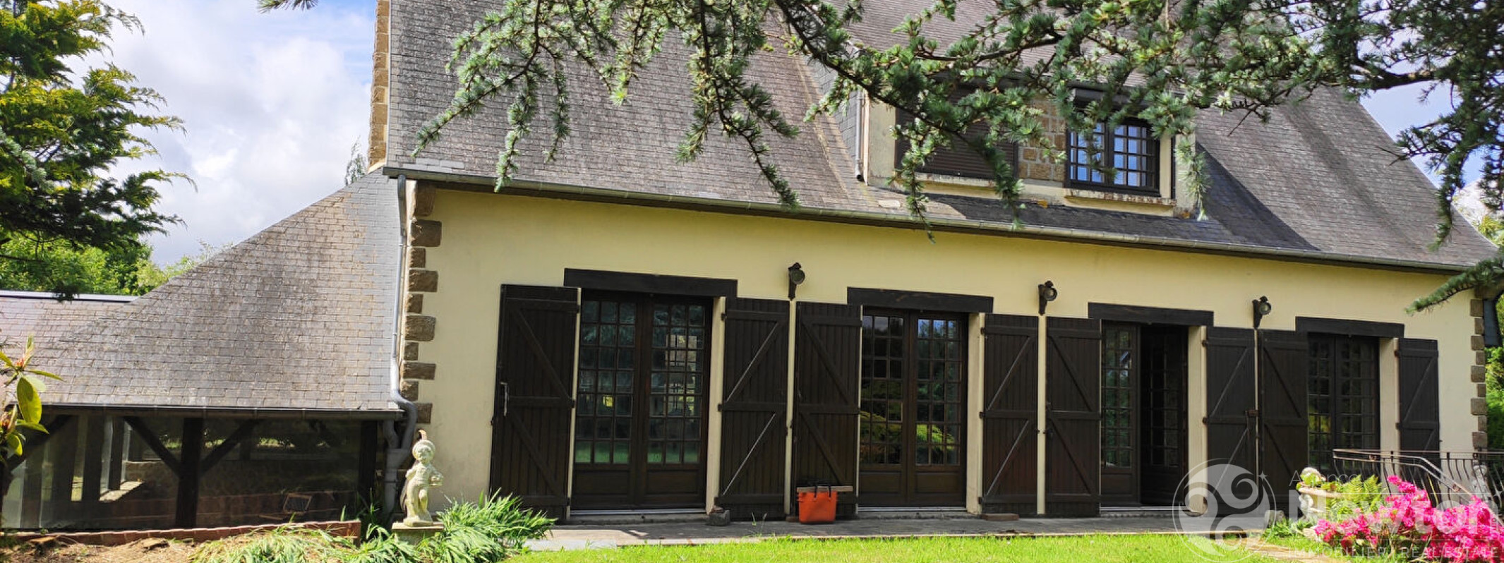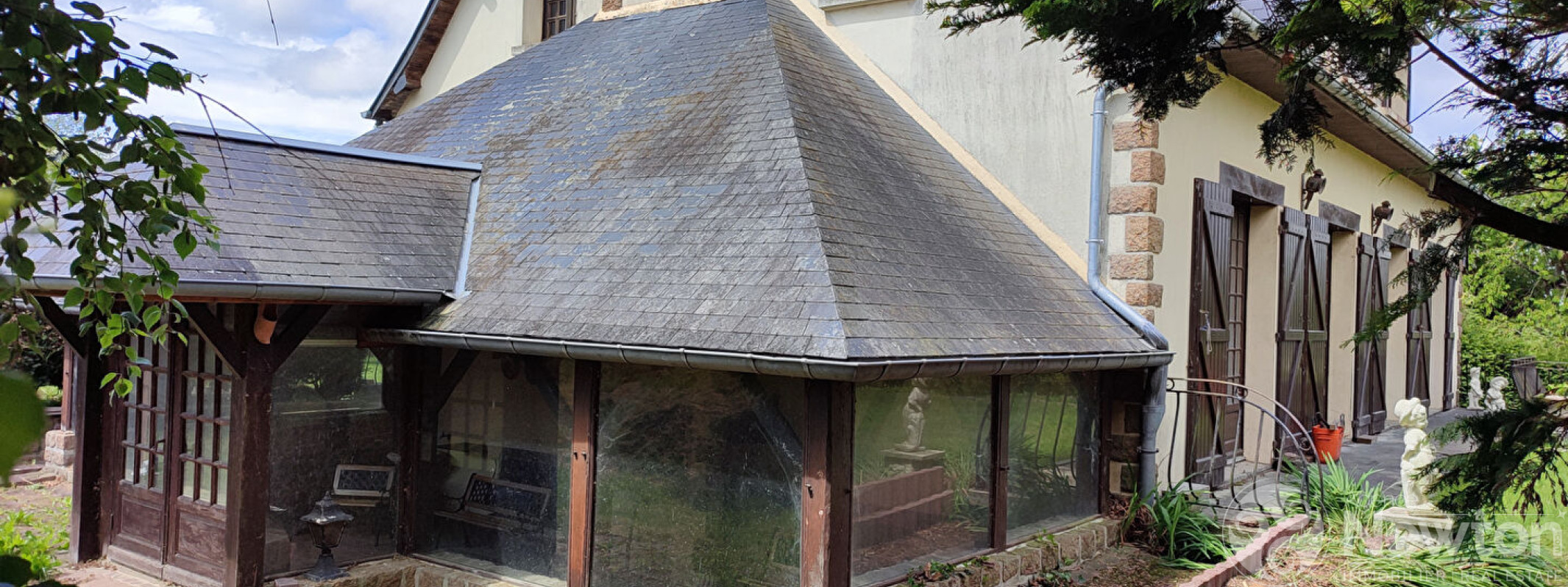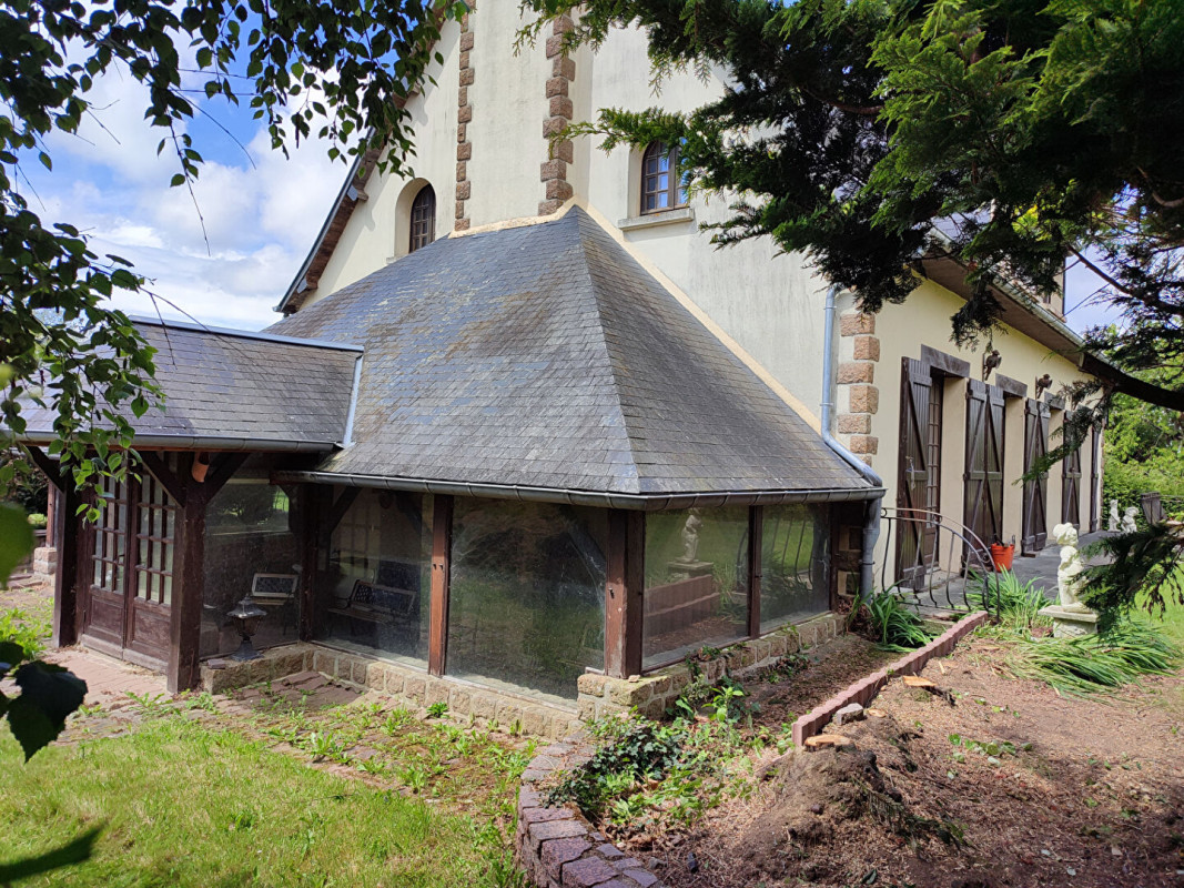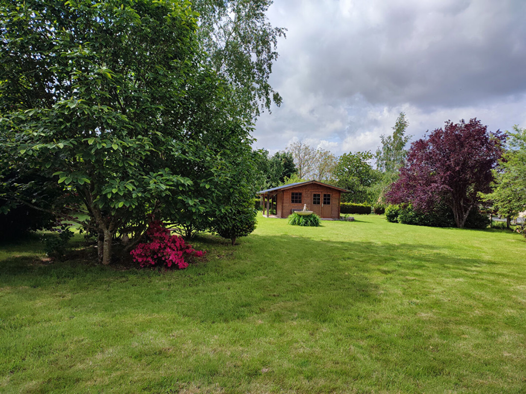 Extérieurs: Verrière attenante avec cheminée - Garage indépendant pour voiture ou atelier - Grand chalet de jardin - Magnifique parc arboré et paysagé de 3500m²