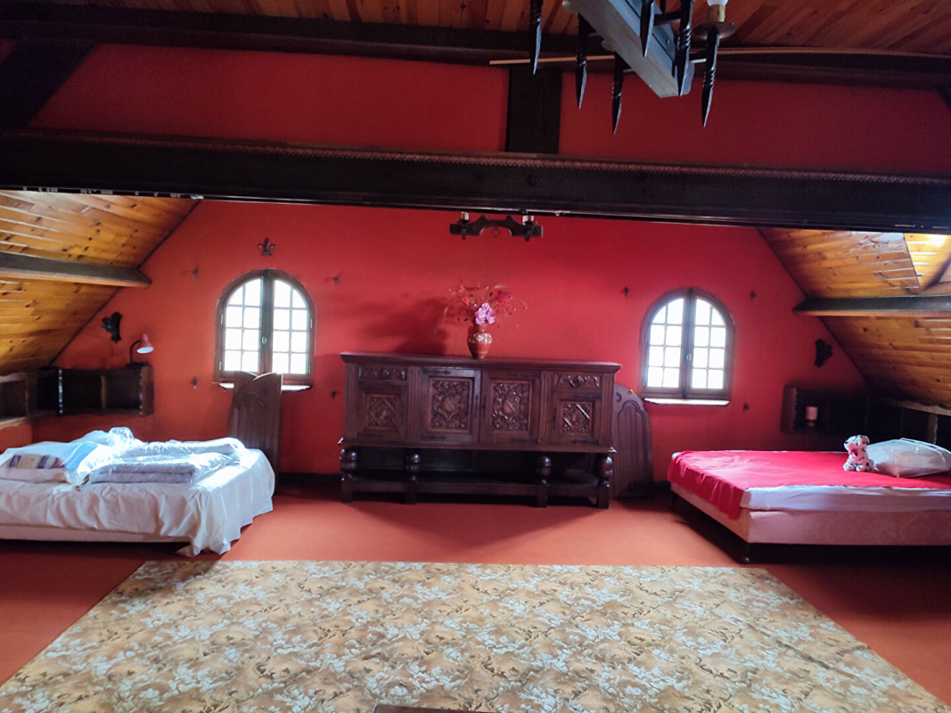 A l'étage: Deux grandes pièces de 50m² chacune avec rangements - Kitchenette - Dalle d'eau et WC séparés.
