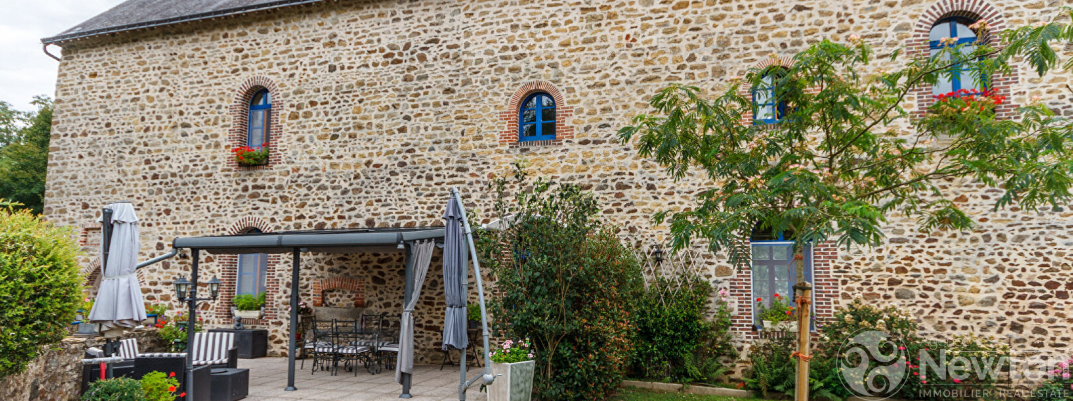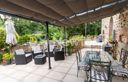 La bâtisse séduit par son architecture en pierre aux teintes douces, et ses fenêtres en arc offrent une belle évocation de son passé. La jolie terrasse vous mène à une vaste entrée double qui s'ouvre sur un grand espace de réception, d'où part un impressionnant escalier en bois massif menant aux 2? et 3? étages.