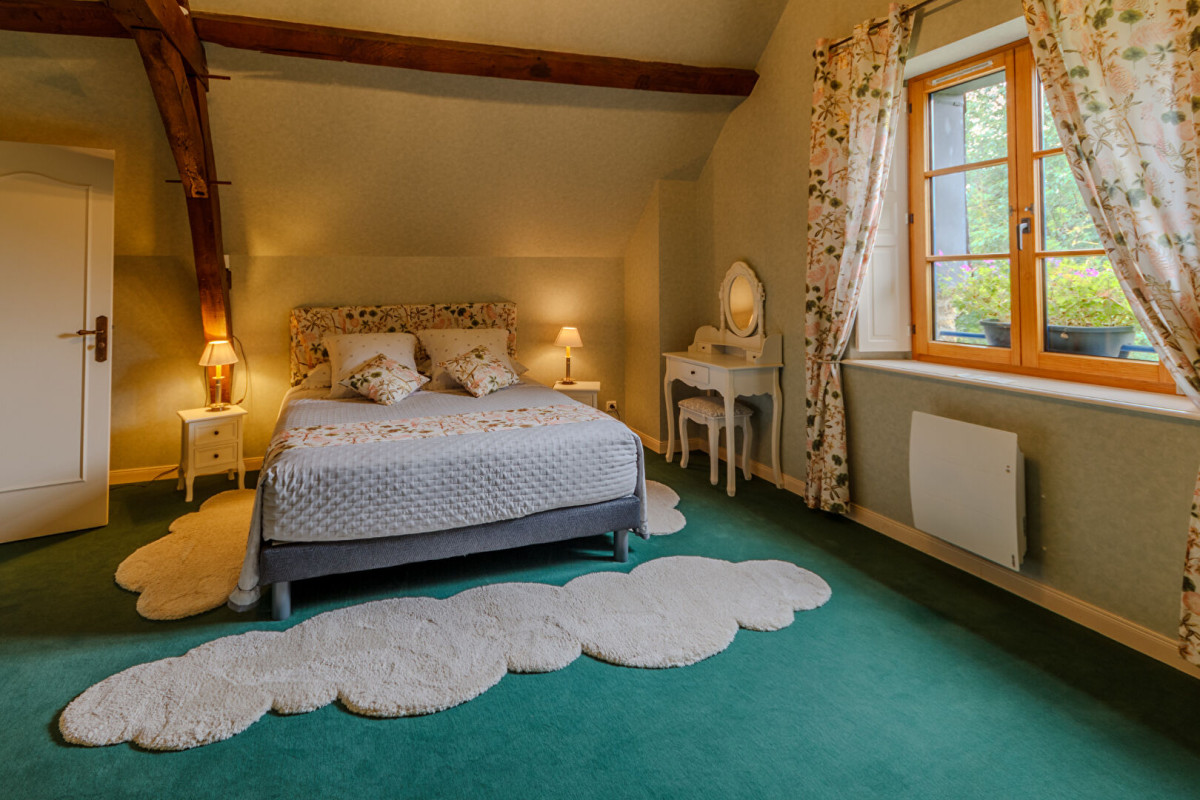 Le dernier étage met en valeur les poutres en chêne d'origine du vieux Moulin. Il accueille deux autres chambres avec salles d'eau et espaces dressing, un salon supplémentaire et une grande buanderie avec local technique.