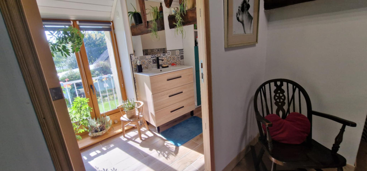 MORBIHAN Maison de campagne bien présentée de 2 chambres, jardin, dépendances et espace attenant à rénover ou à utiliser comme studio.