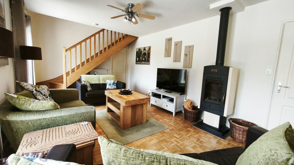 Cette jolie maison construite en 2007 se trouve dans le village de Kernascleden. Elle offre un cadre unique, avec le charme du village à l'avant et la tranquillité de la campagne à l'arrière.
