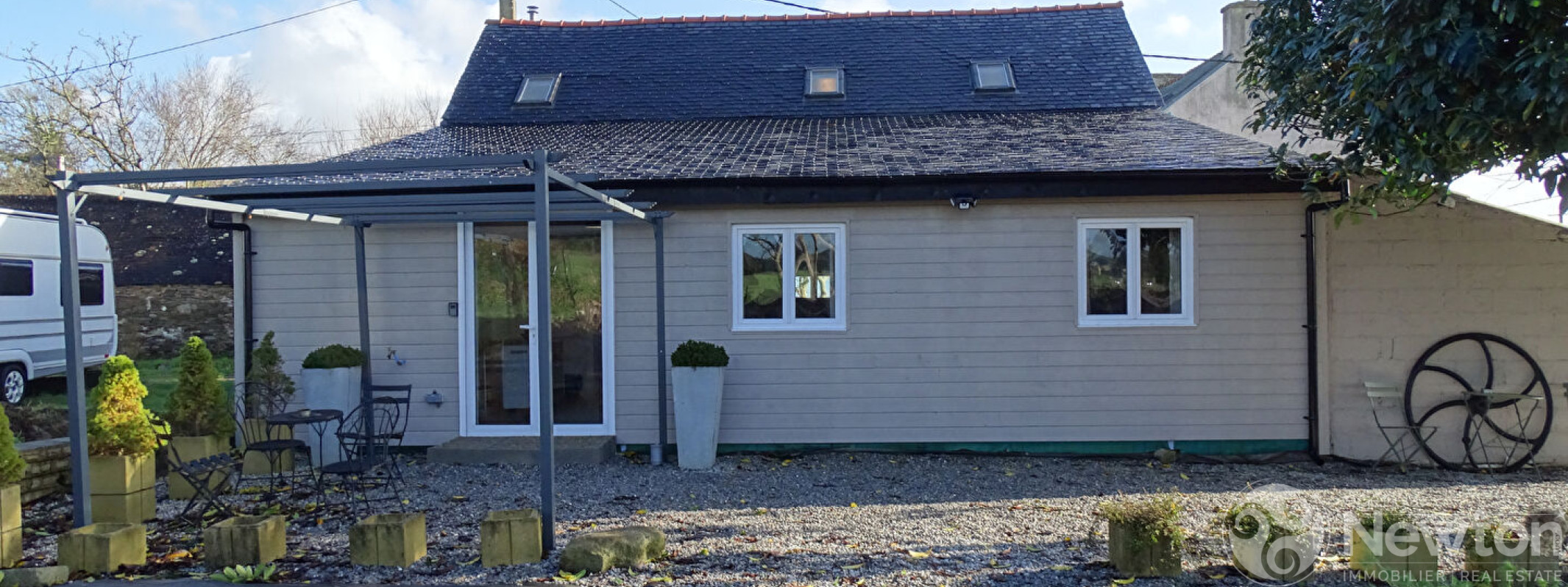 A l'extérieur, un atelier attenant et une allée gravillonnée peuvent accueillir au moins quatre voitures. Le jardin, situé à l'arrière, dispose d'une terrasse gravillonnée. Agréablement fleuri, il est facile d'entretien.