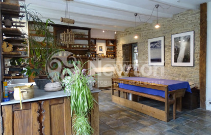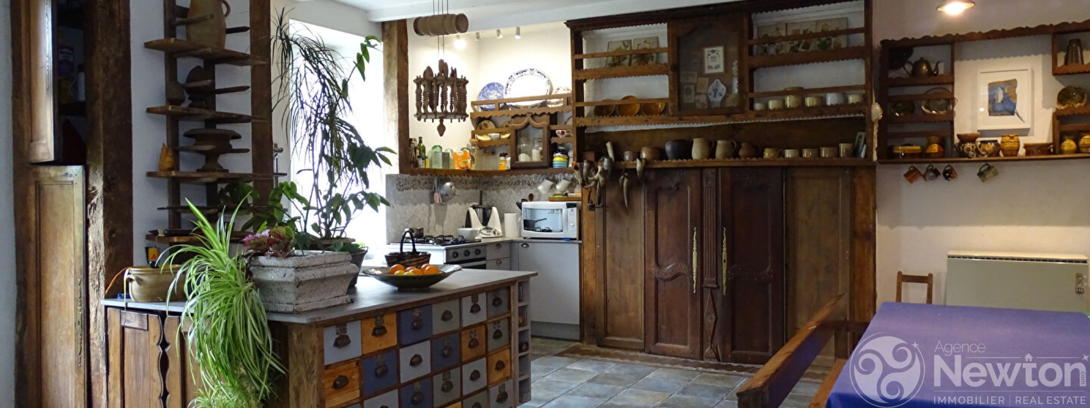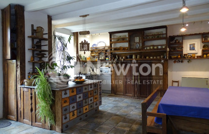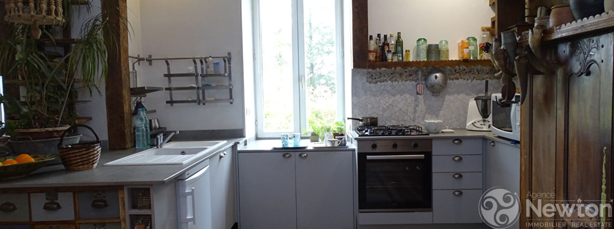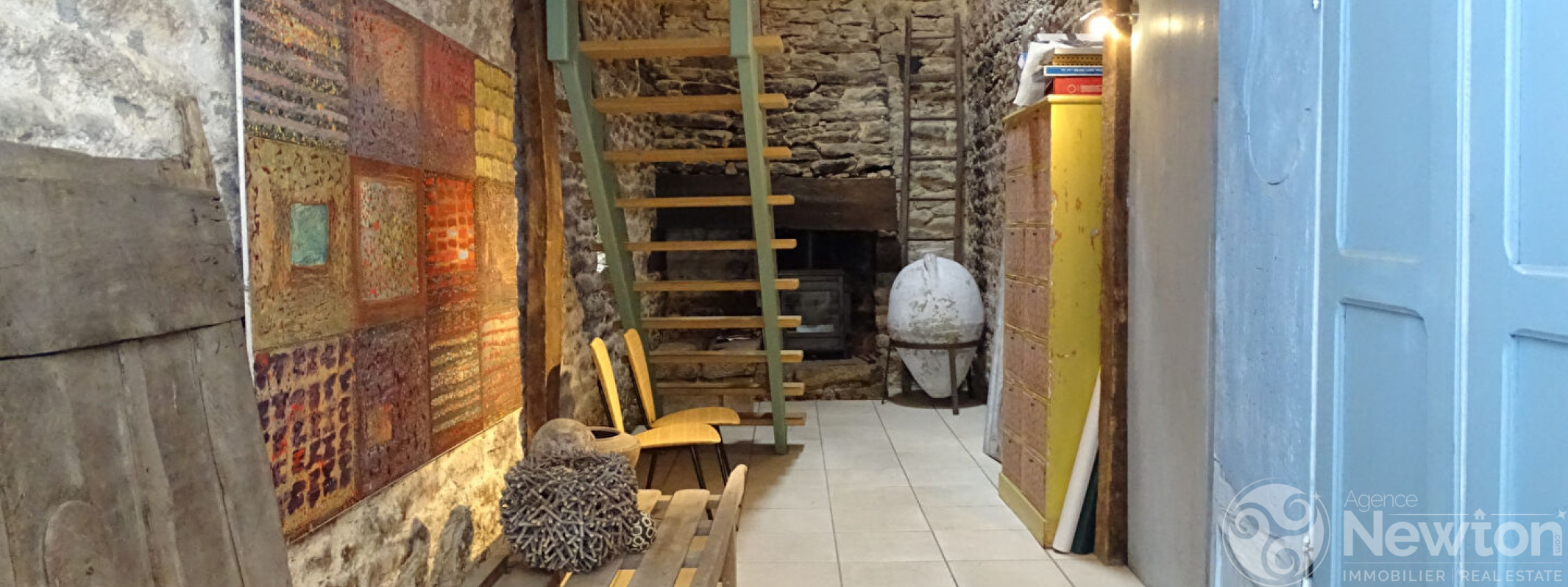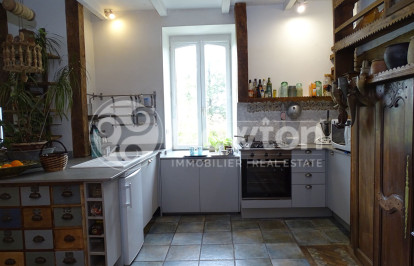Au rez-de-chaussée, vous entrez dans un grand espace de vie ouvert avec une cuisine/salle à manger entièrement aménagée et équipée, conçue avec goût et intégrant certains éléments d'origine. Le salon dispose d'une cheminée en pierre avec un poêle à bois qui le rend confortable en hiver.