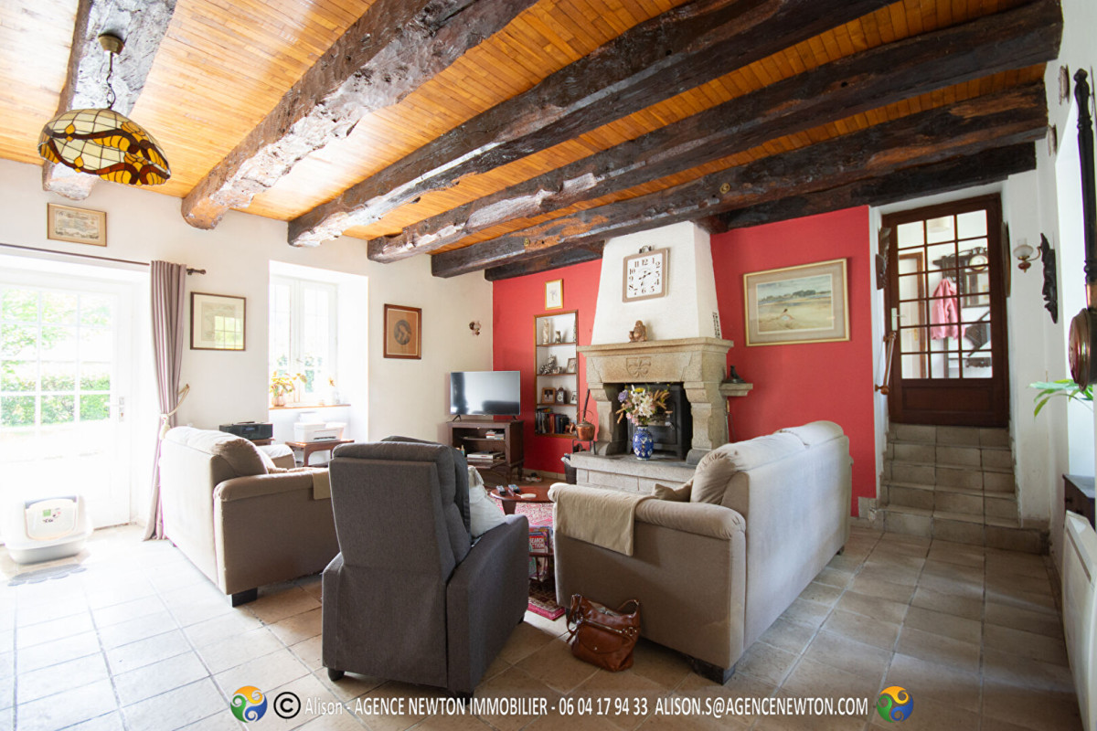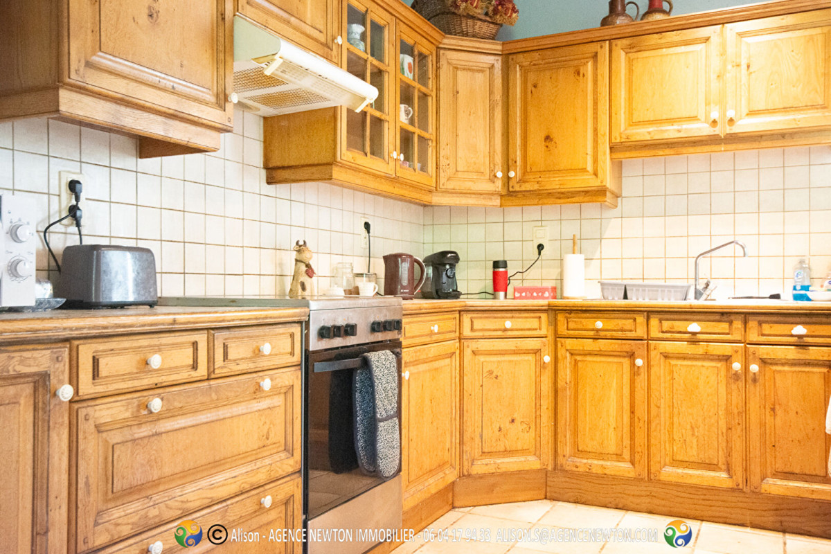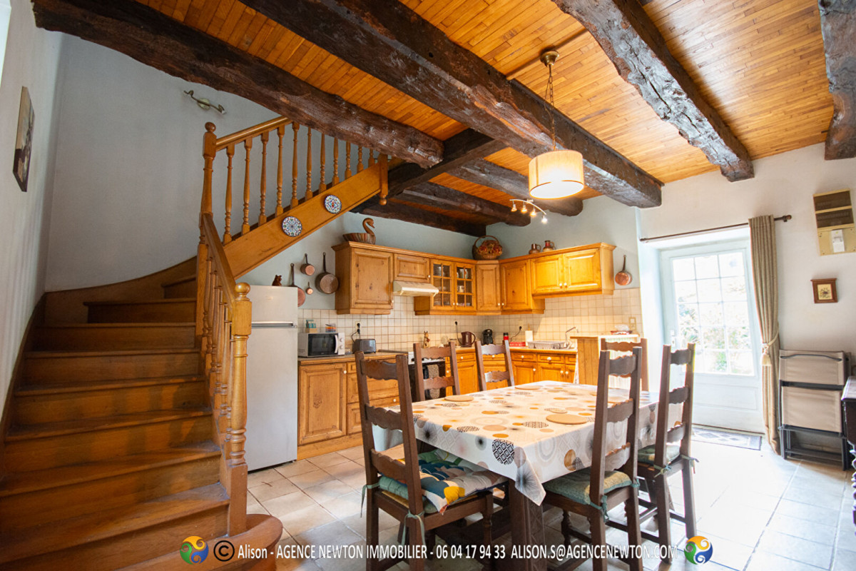 Cuisine entièrement équipée avec coin repas (24 m²), salon (27 m²) avec cheminée à bois, couloir intérieur menant à la chambre du rez-de-chaussée (10 m²), salle de bains et WC avec accès arrière à la terrasse extérieure et au jardin.