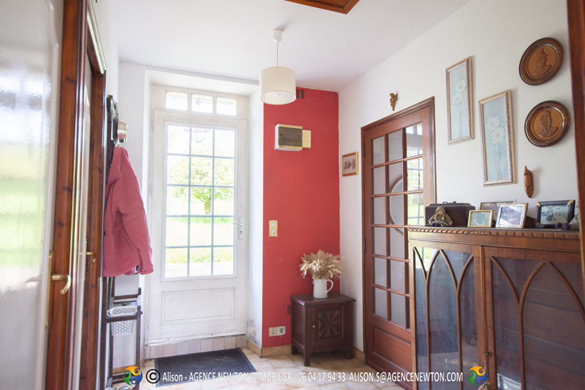 La maison est entourée de campagne et située en retrait d'une rue calme. Parking goudronné, jardin et haies. Le terrain est principalement gazonné, agrémenté d'arbustes et d'arbres.