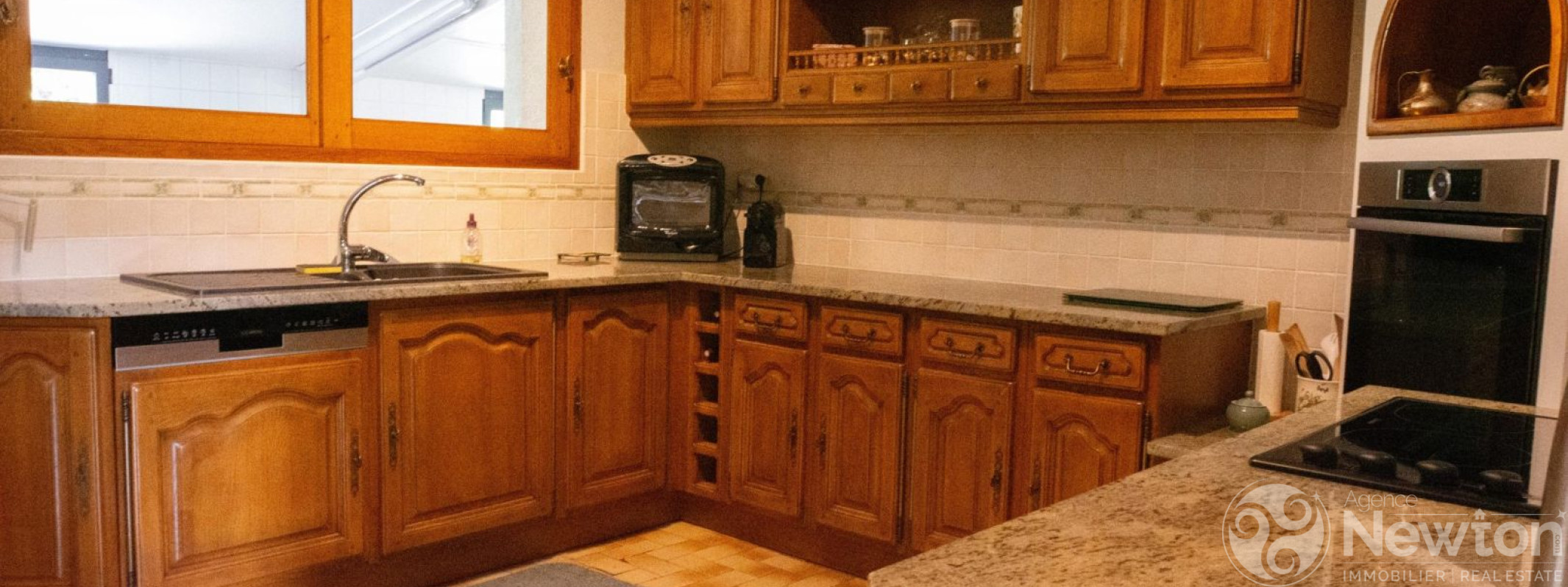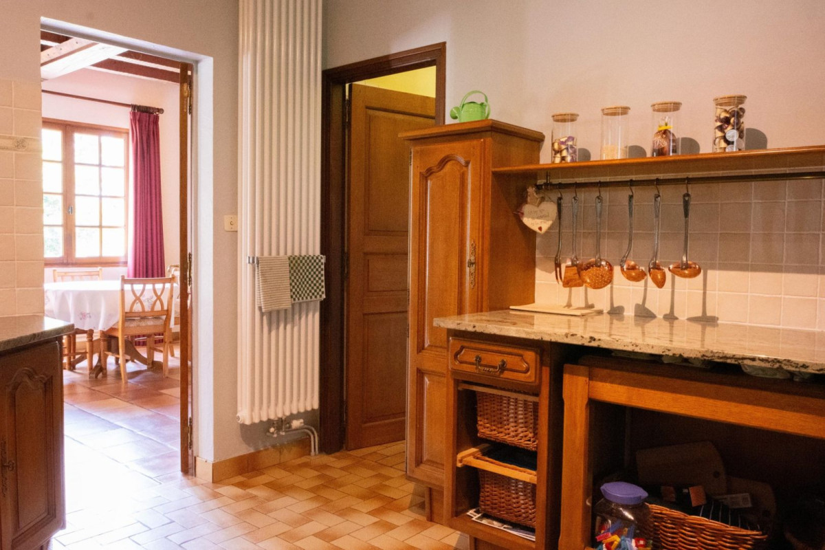 La cuisine, 15 m2, entièrement équipée avec plans de travail en granit, four et plaque de cuisson intégrés. Beaucoup d'espace de travail et de rangement. Derrière la cuisine se trouve une arriere-cuisine (21 m2).