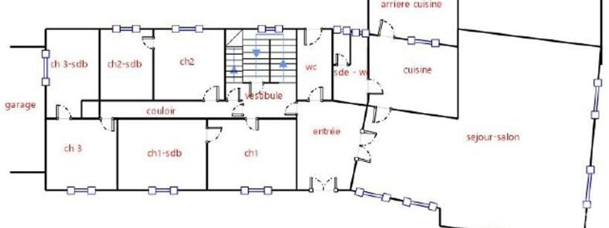 A partir du hall d'entrée principal, nous entrons dans un couloir intérieur desservant 3 chambres de très bonne taille au rez-de-chaussée. Le couloir intérieur (7,8 m²) comprend un escalier menant à l'étage suivant avec une belle rampe en fer forgé.