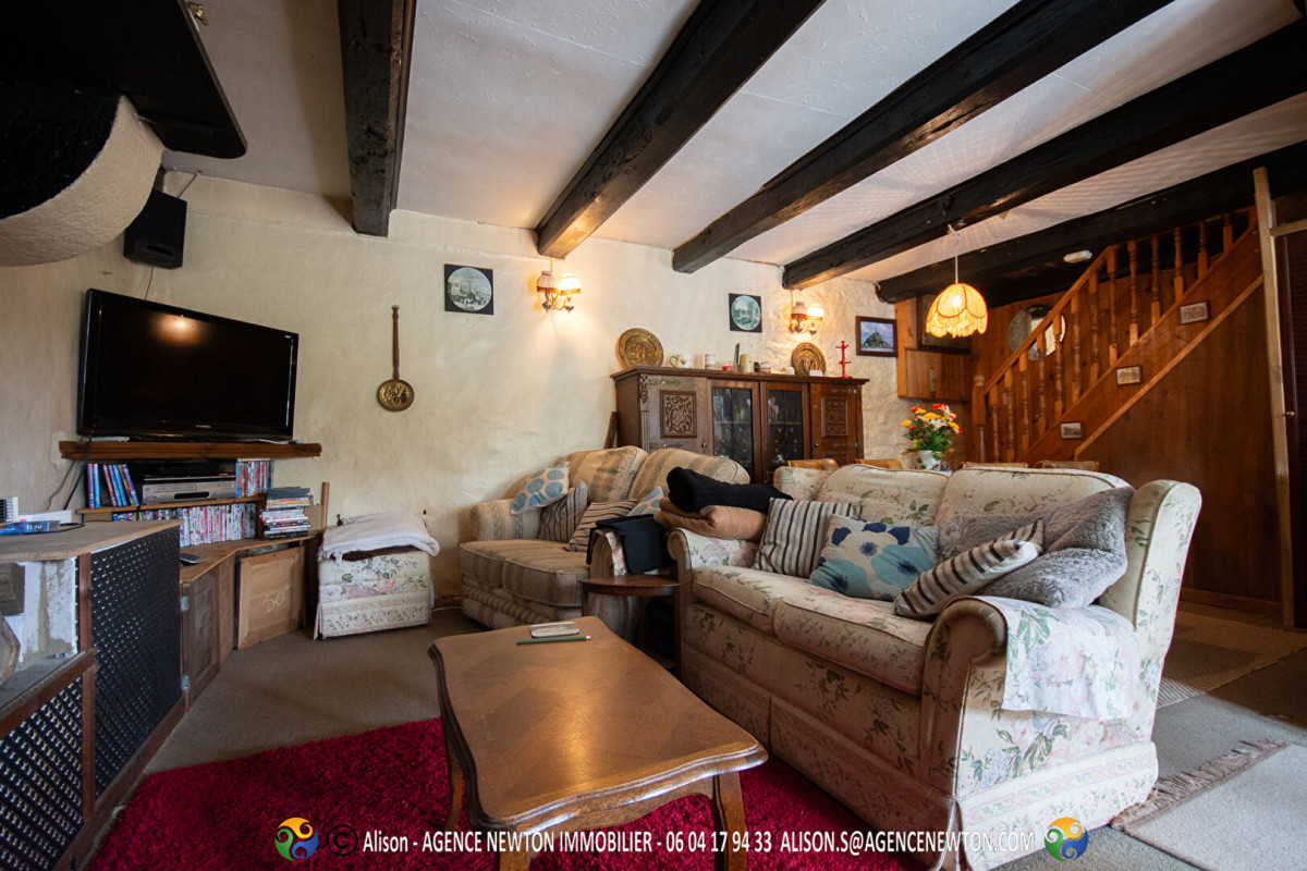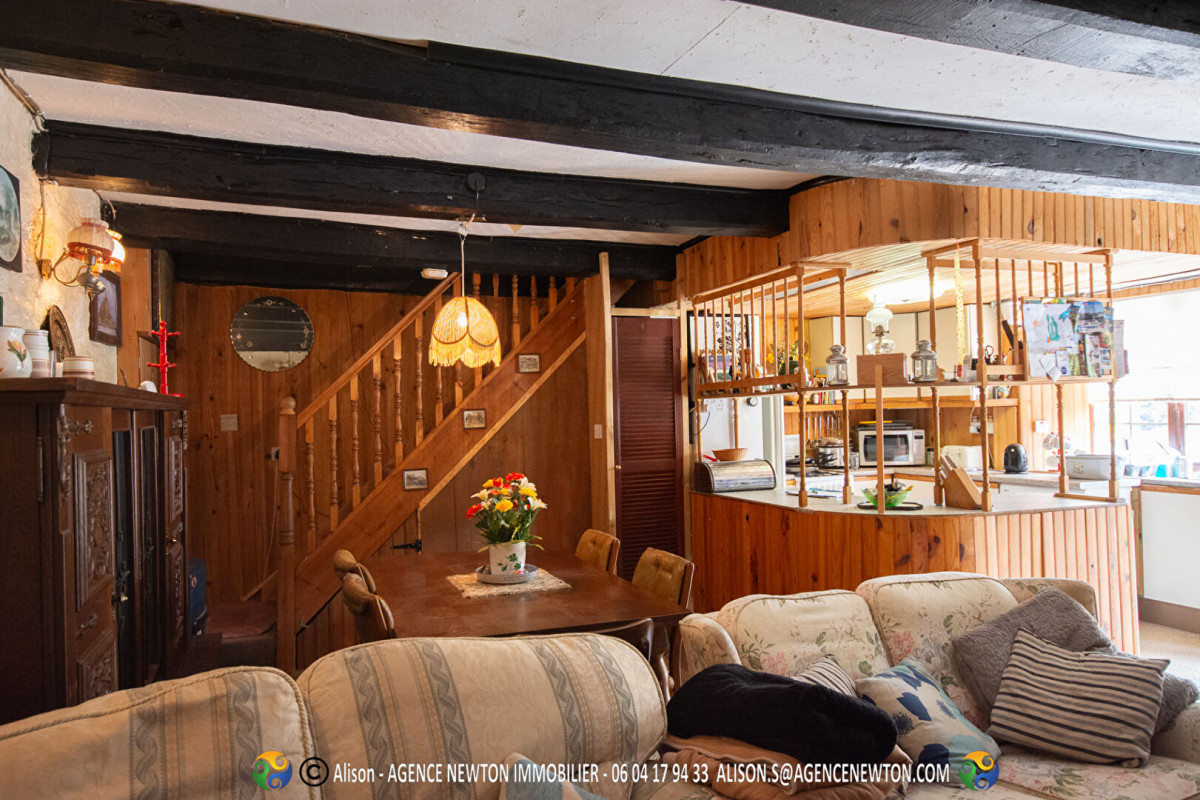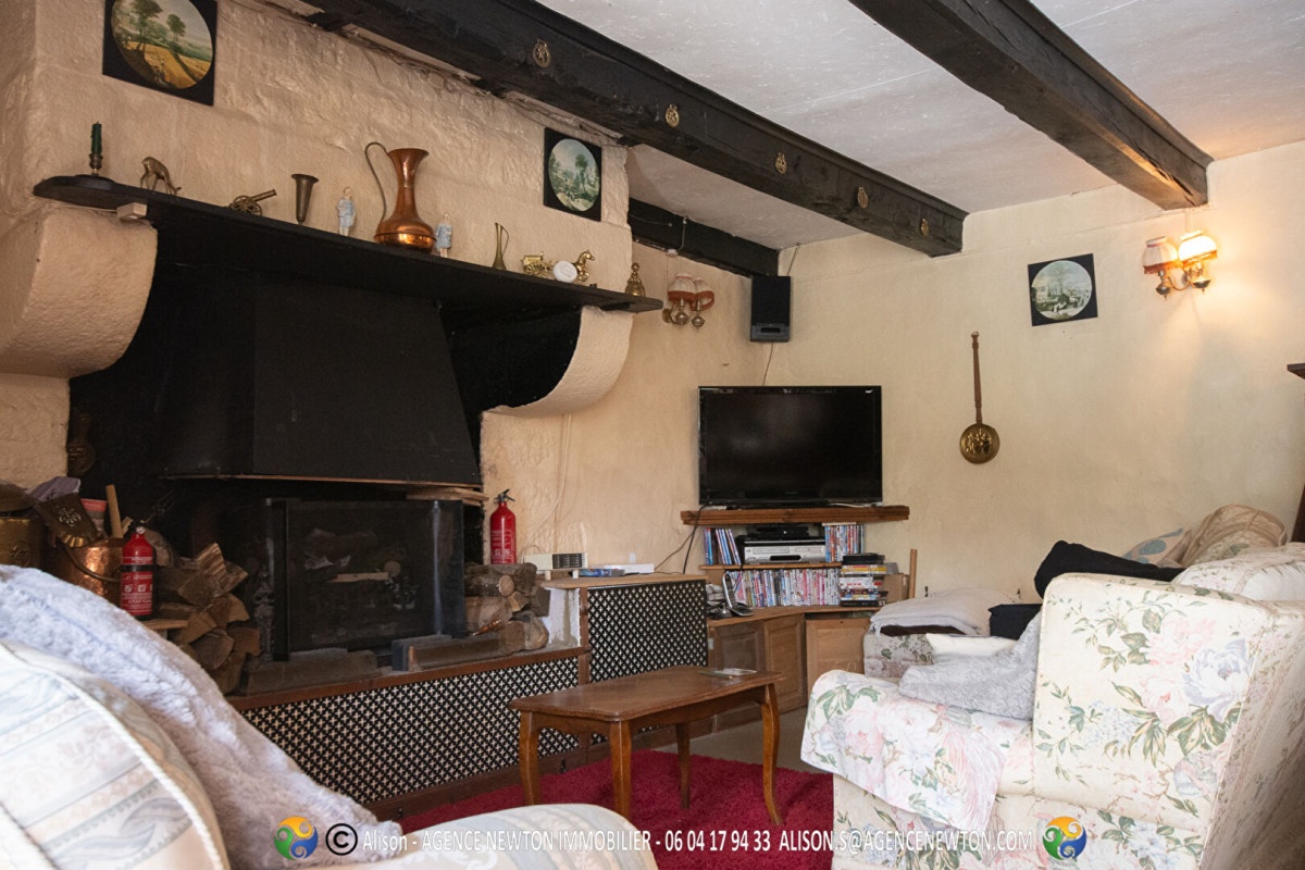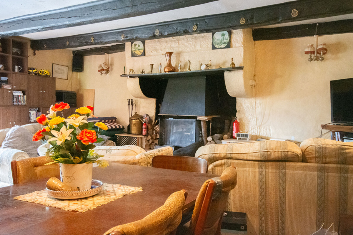 La porte principale mène directement au séjour avec poutres apparentes et cheminée ancienne en granit. Actuellement aménagé avec un coin cuisine.