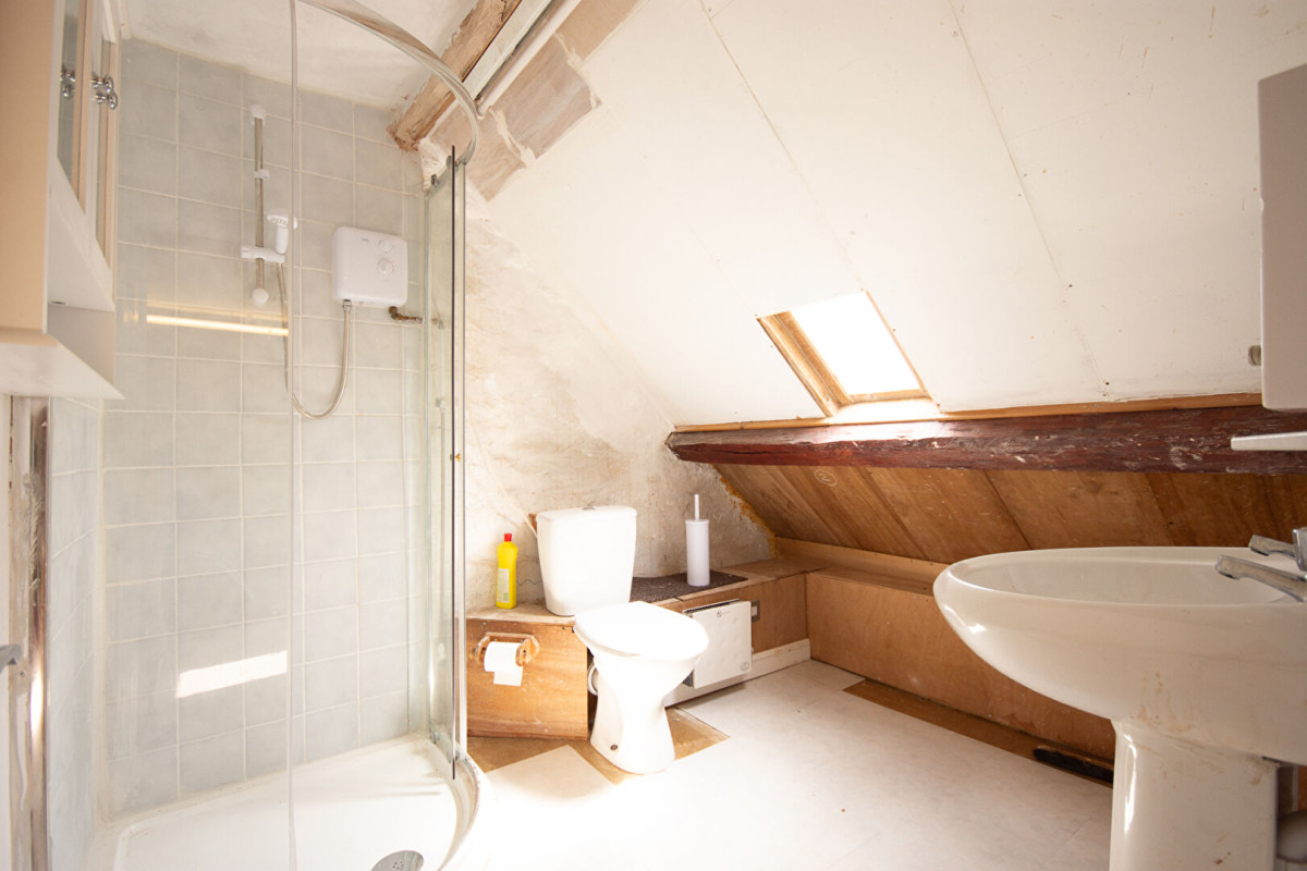Un 2eme escalier mène à une grande chambre avec Velux et salle de bain attenante, lavabo, WC et cabine de douche moderne, partiellement carrelée.