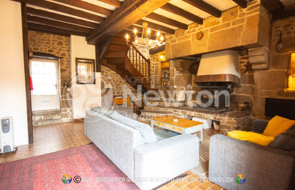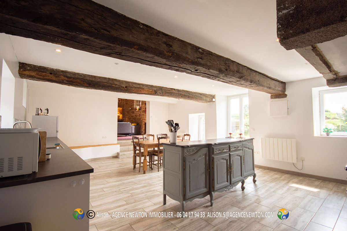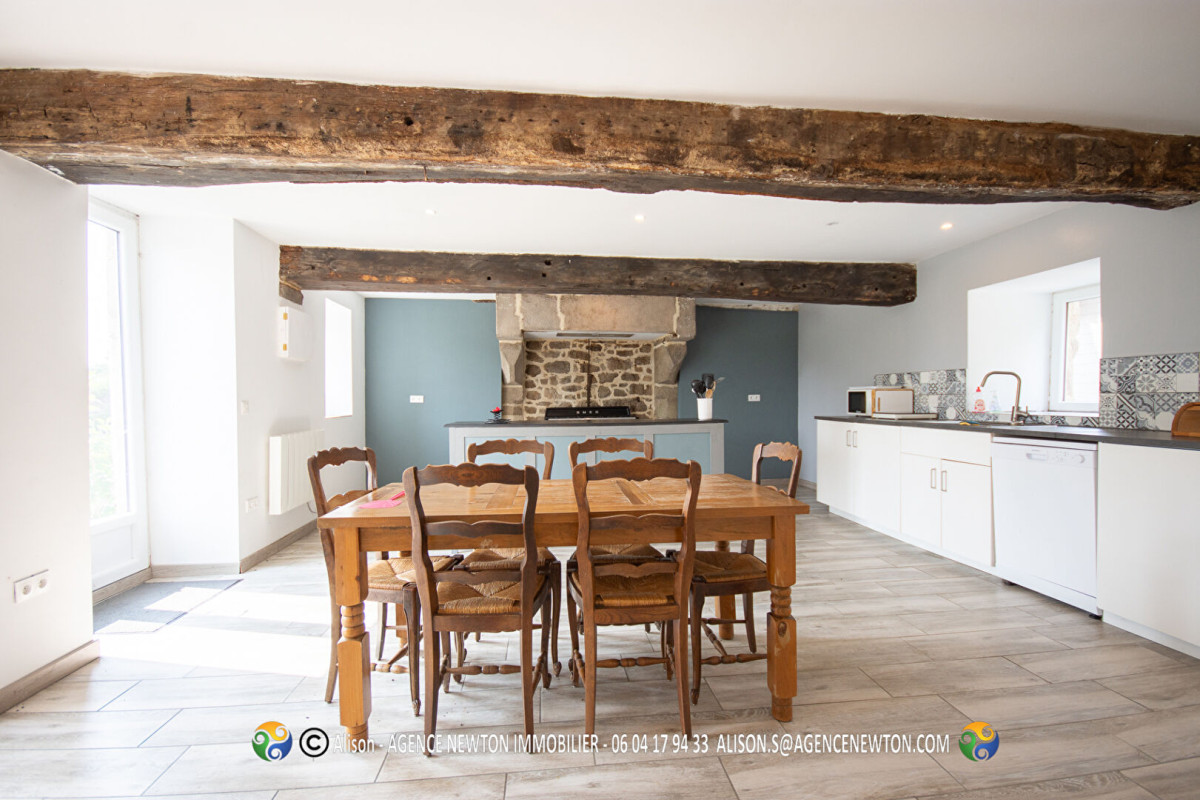 La cuisine spacieuse promet de chaleureux moments partagés, tandis que le salon, baigné de lumière, séduit par son poêle à bois et son atmosphère enveloppante, parfaite pour des soirées douillettes.